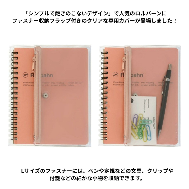 ファスナー収納のフラップ付き、ロルバーン ポケット付メモ専用カバー Mサイズです。お気に入りの表紙を保護しながら、ファスナー部分に小物を収納して持ち運ぶことができます。リングタイプのロルバーンダイアリーにも使用可能。