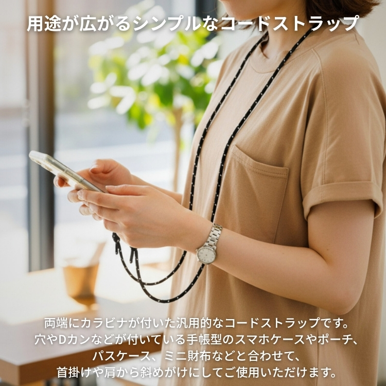 穴やDカンなどが付いている手帳型のスマホケースやポーチ、パスケース、ミニ財布などと合わせて、首掛けや肩から斜めがけにしてご使用いただけます。