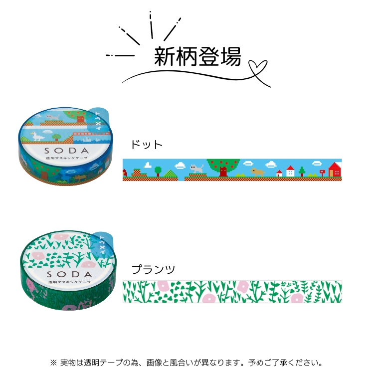 貼ってはがせる透明フィルム素材のマスキングテープ「SODA」。2021年12月、待望の新柄が登場!曲面にも貼りやすく、手帳やラッピングはもちろん幅広いデコレーションに活用できます。