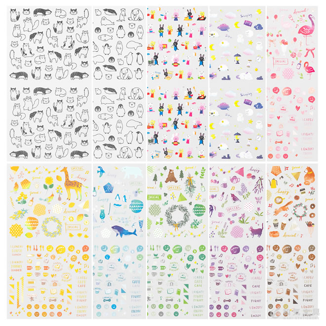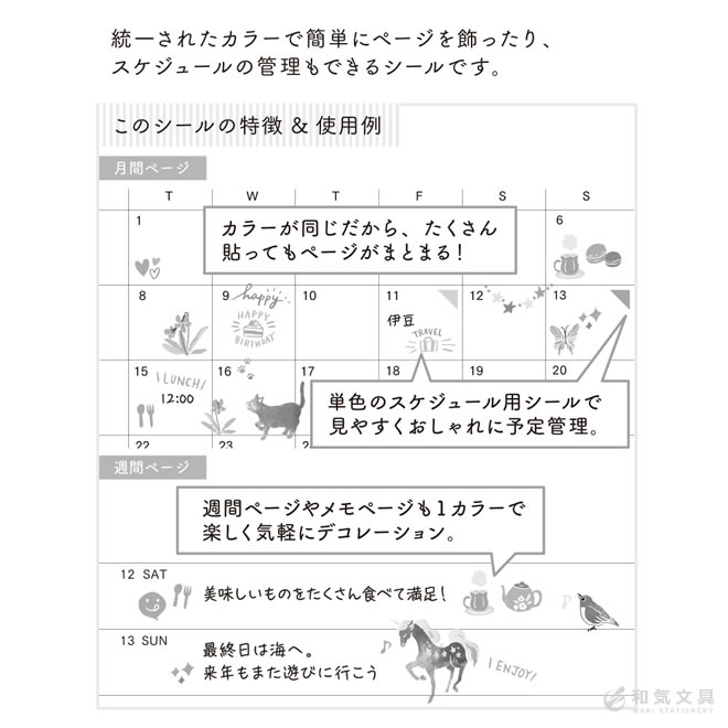 重ねてきれい!手帳やノートの余白や日付を楽しく彩るシールです。半透明シールなので、重ねてきれいに飾れます。 再剥離タイプなので気軽に貼れて、2シート入りでたっぷり使えます。