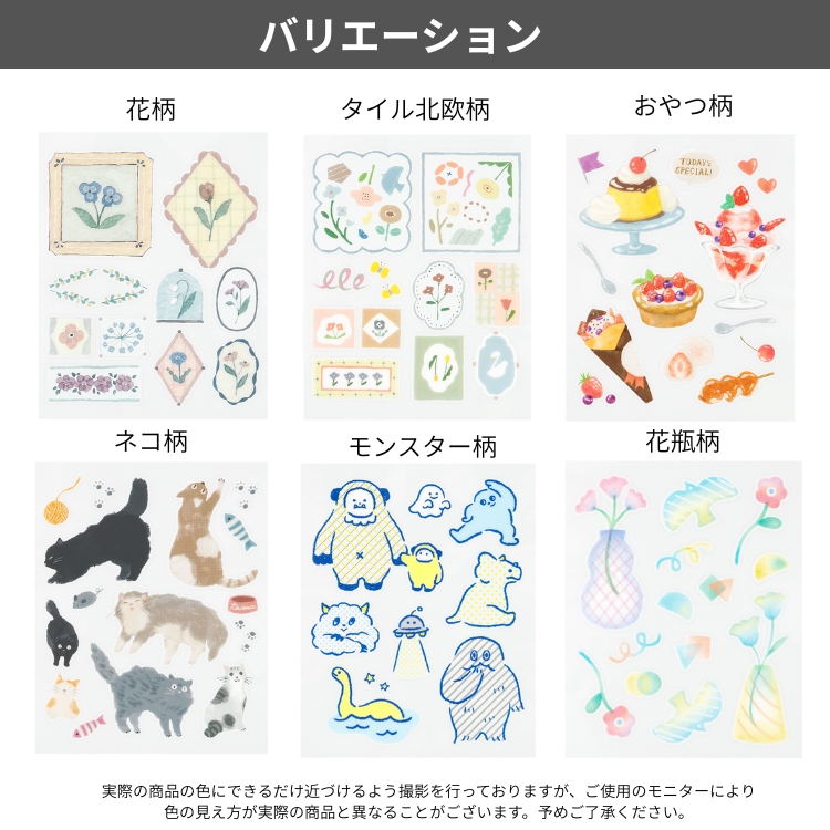手帳、ノートのデコレーションを楽しむためのマスキングテープ素材のシールです。半透明なので、重ねて貼ることでより楽しいデザインができ上ります。