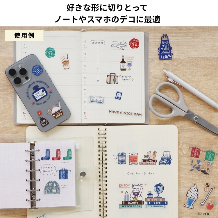 シールにはキラキラとしたオーロラ加工を施し、高精細印刷によって各クリエイターの世界観をクリアに表現しています。カットラインがないので好きな形に切り取って使うことができ、ノートデコのパーツにも最適です。