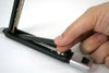 ロックボタンを押しながらストッパーを引くことで裏ふたが開く安心設計です。