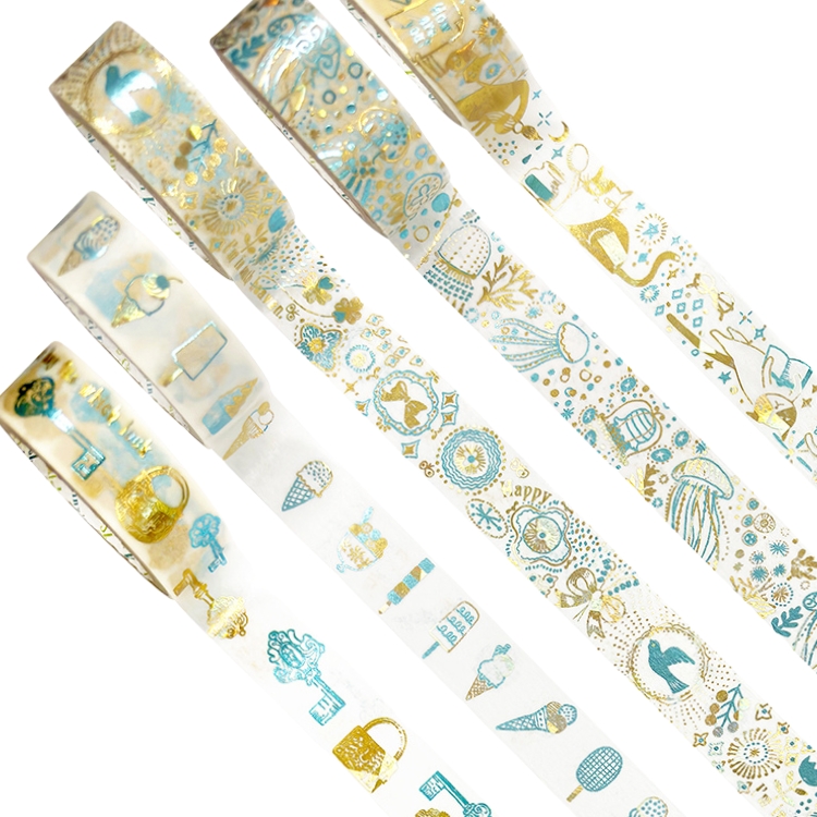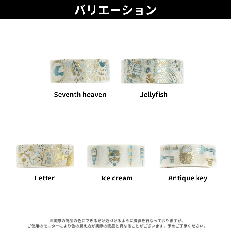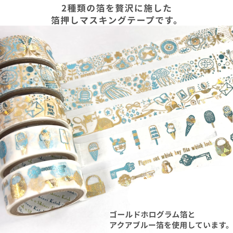 Shinzi katoh(シンジカトウ)のかわいらしいイラストを使用した、2種類の箔を贅沢に施した箔押しマスキングテープです。