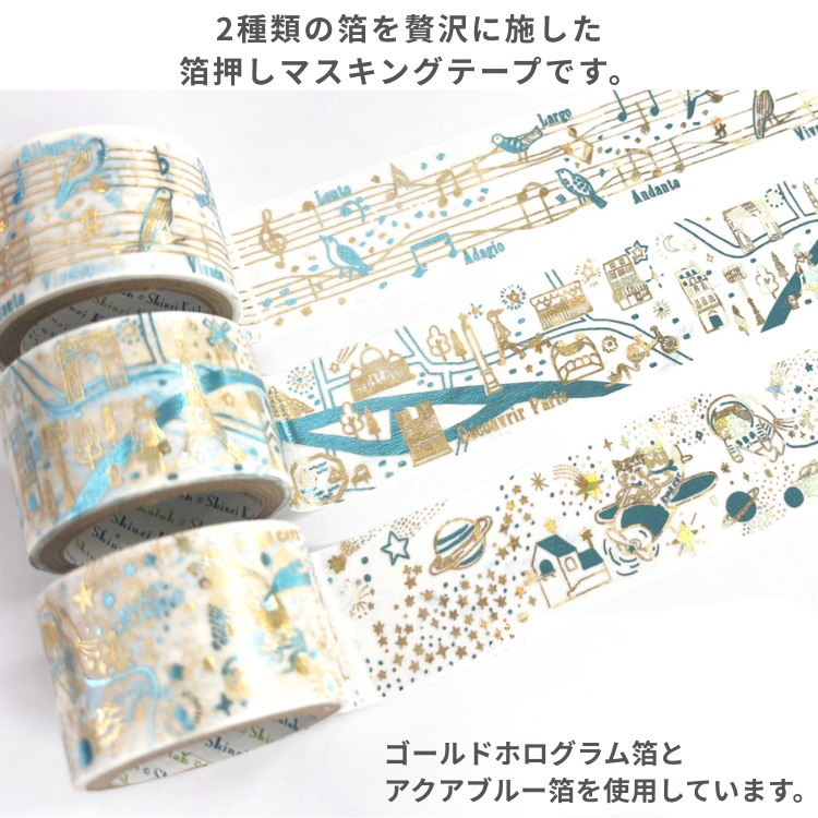 Shinzi katoh(シンジカトウ)のかわいらしいイラストを使用した、2種類の箔を贅沢に施した箔押しマスキングテープです。