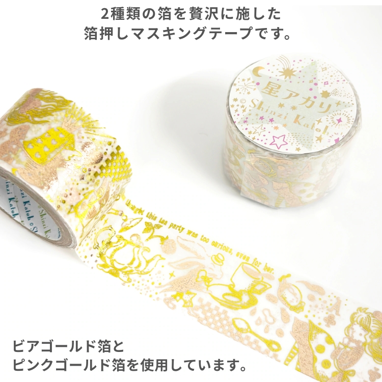 Shinzi katoh(シンジカトウ)のかわいらしいイラストを使用した、2種類の箔を贅沢に施した箔押しマスキングテープです。