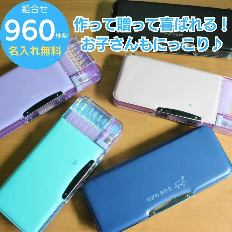 お子様の大好きなマーク、カラーなどを選んで960通りの中からオリジナルの名入れ筆箱を作成する事ができます!贈り物に最適です!