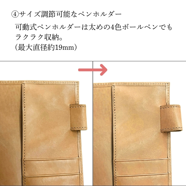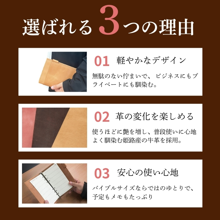 水牛革を使用し、普段使いしやすく、軽くて気軽に持ち運べるベルト付きシステム手帳。目を引くステッチの遊び心がポイント。