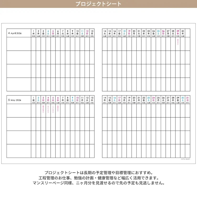 自費出版から始まり今や累計30万部突破の人気手帳CITTA(チッタ)手帳=スケジュールではない「未来を予約する手帳」というコンセプトの元書いたことを実現させていくためのツールとして人気の高い手帳です。