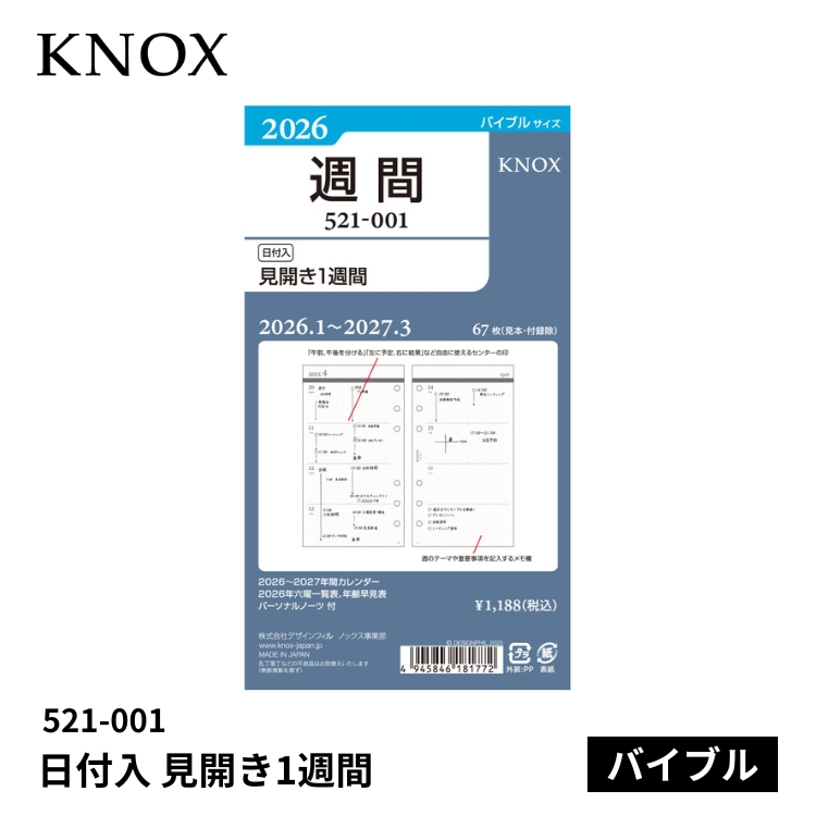ノックス システム手帳 リフィル 日付入 片面1週間片面メモ バイブルサイズ 521-002