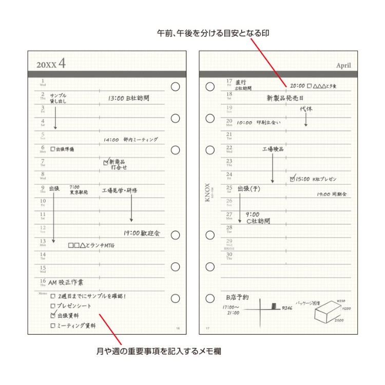 ノックス システム手帳 リフィル 日付入 見開き1ヵ月間ブロック式+見開きメモ バイブルサイズ 521-107