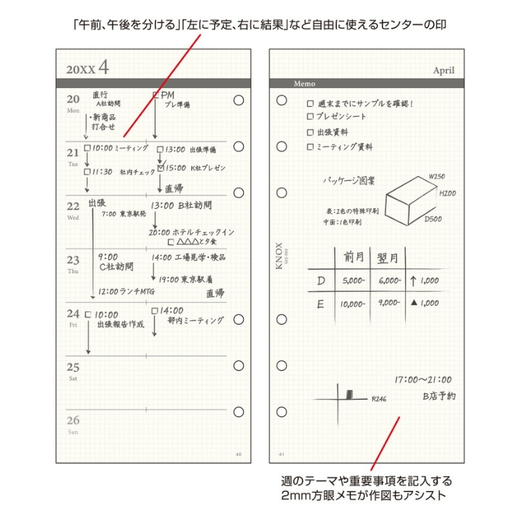 ノックス システム手帳 リフィル 日付入 見開き1週間 ナロー 522-001