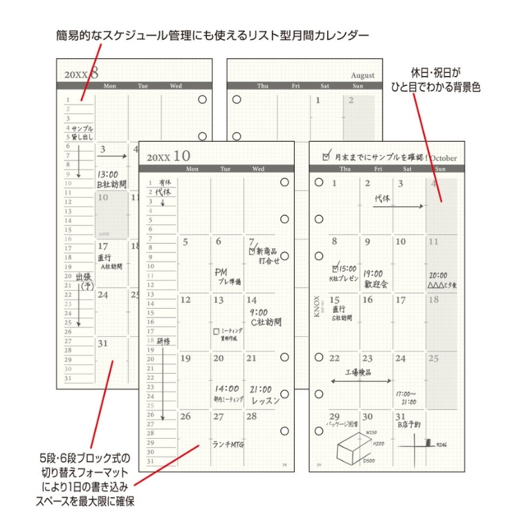 ノックス システム手帳 リフィル 日付入 見開き1ヵ月間ブロック式平日ワイド ナロー 522-102