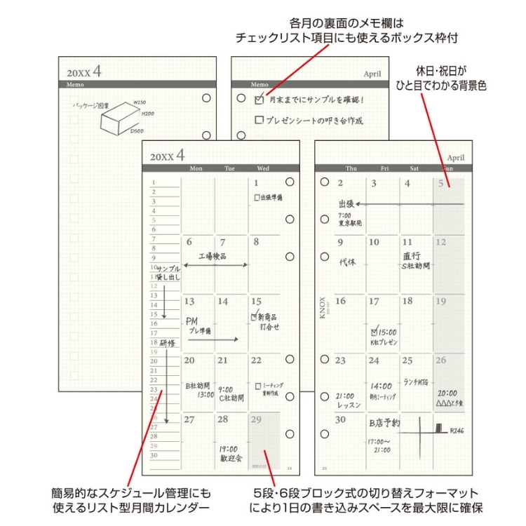 ノックス システム手帳 リフィル 日付入 見開き1ヵ月間ブロック式 ナロー 522-101