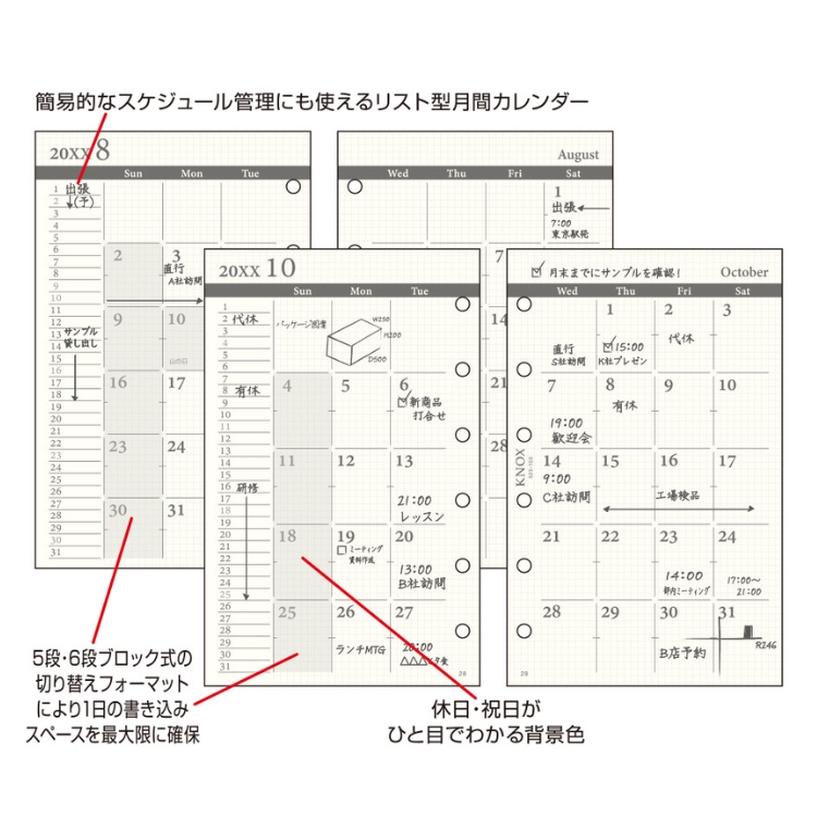 ノックス システム手帳 リフィル 日付入 見開き1ヵ月間ブロック式 ミニ 523-101