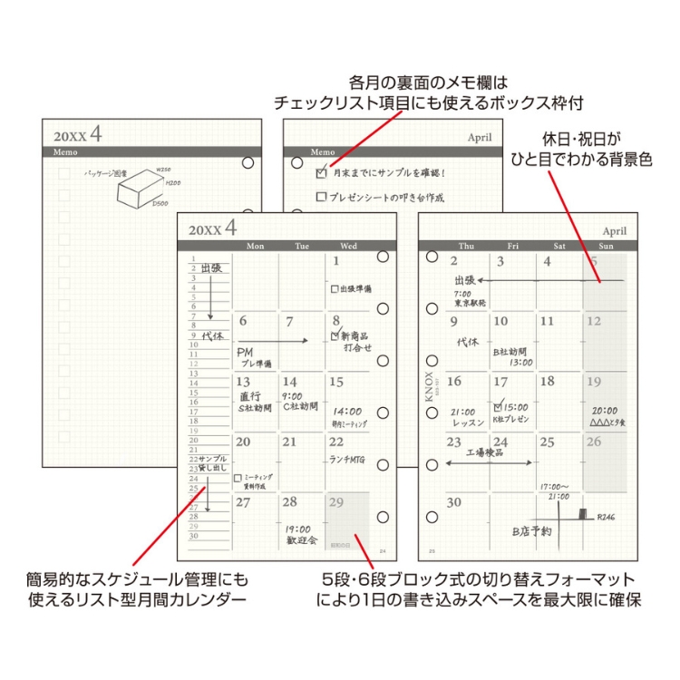 ノックス システム手帳 リフィル 日付入 見開き1ヵ月間ブロック式日曜始 ミニ 523-103