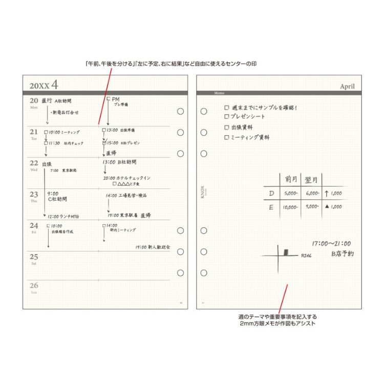 ノックス システム手帳 リフィル 日付入 見開き1ヵ月間ブロック式+片面1週間片面メモ A5 524-152