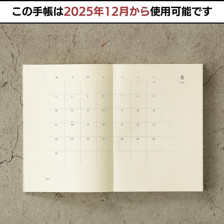 ダイアリー本来の機能と、自由に書くことの愉しさを共存させるため、極限まで削ぎ落としたデザインの『MD ノートダイアリー』を、月間ページとメモスペースのみにスリム化し、携帯性を重視したのが『MD ノートダイアリー 薄型』です。