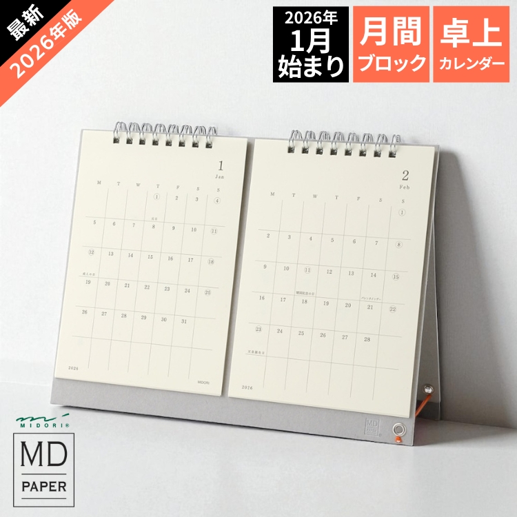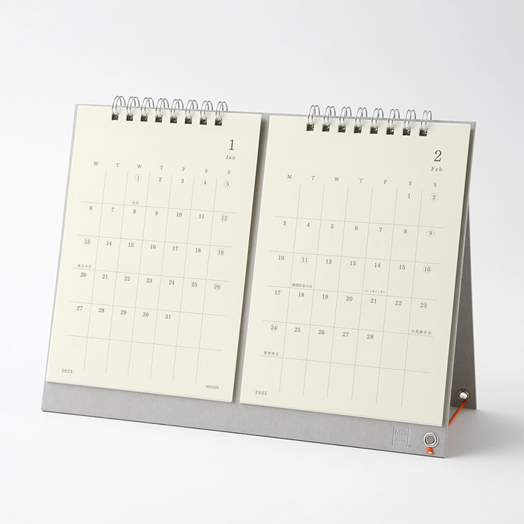 「MDノートダイアリー」のフォーマットを踏襲し、12ヵ月のカレンダーページと無罫のメモページで構成した、ミニマルなデザインの卓上カレンダー。