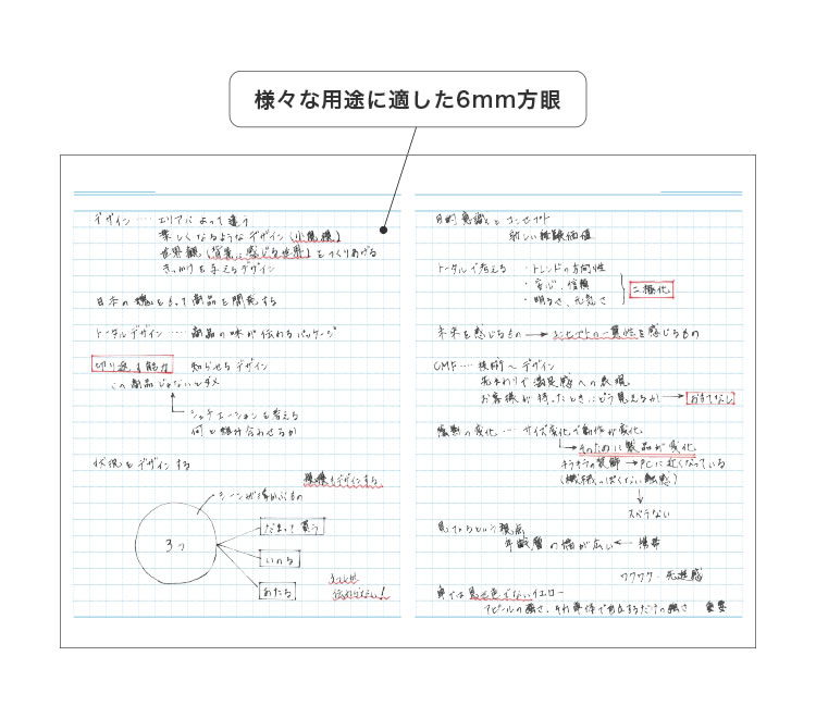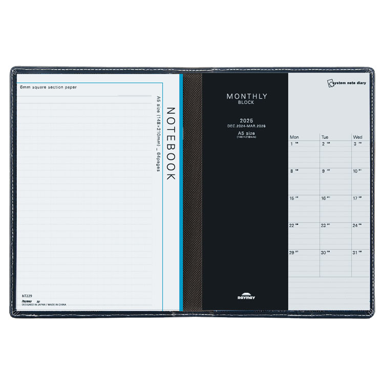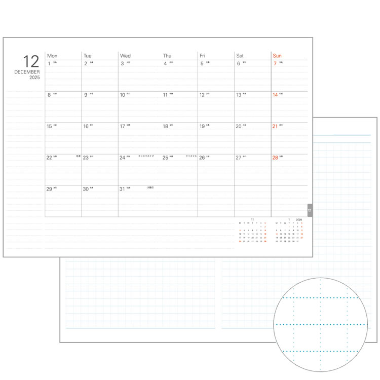 スケジュールとノートを1冊で管理(マンスリー+別冊ノート)6mm横罫線入りで描き揃えやすいマンスリー。軽くて丈夫な特殊ペーパー製カバー。