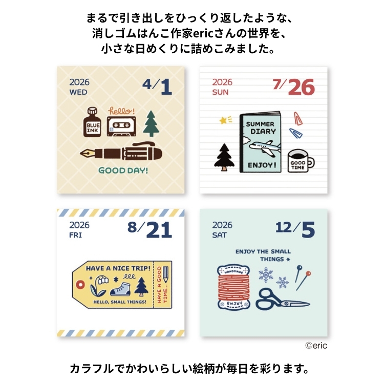 消しゴムはんこ作家ericさんの描くモチーフが、さらに小さなカレンダーになりました。4.5×3cmのミニミニサイズで、ノートや手帳のデコレーション用としても楽しめます。めくったページをぜんぶ残しておきたくなる、とても小さな日めくりカレンダーです。
