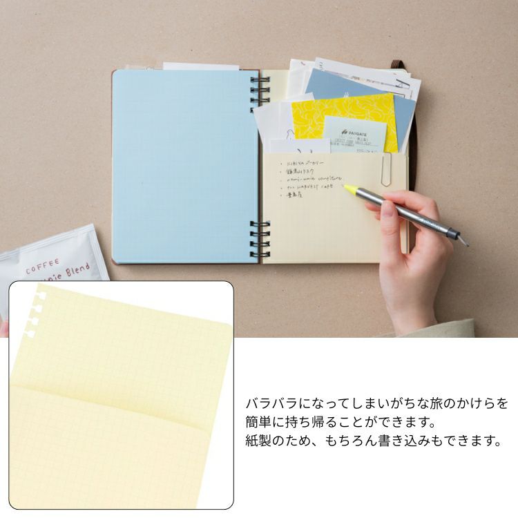 旅で手にしたチケット、パンフレット、レシート、ショップカードなどをポケット部分に入れて収納できるほか、方眼メモとして、スケジュールや目的地、その瞬間に感じたことを書くのにも最適です。