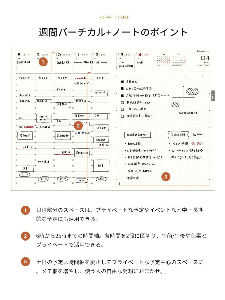 バーチカル+メモは、左側がバーチカル式+右が方眼メモ欄で1日を時間で管理したい人にオススメ。開きやすさや使いやすさ、用紙や書き味、書体の視認性にまで徹底的にこだわりました。