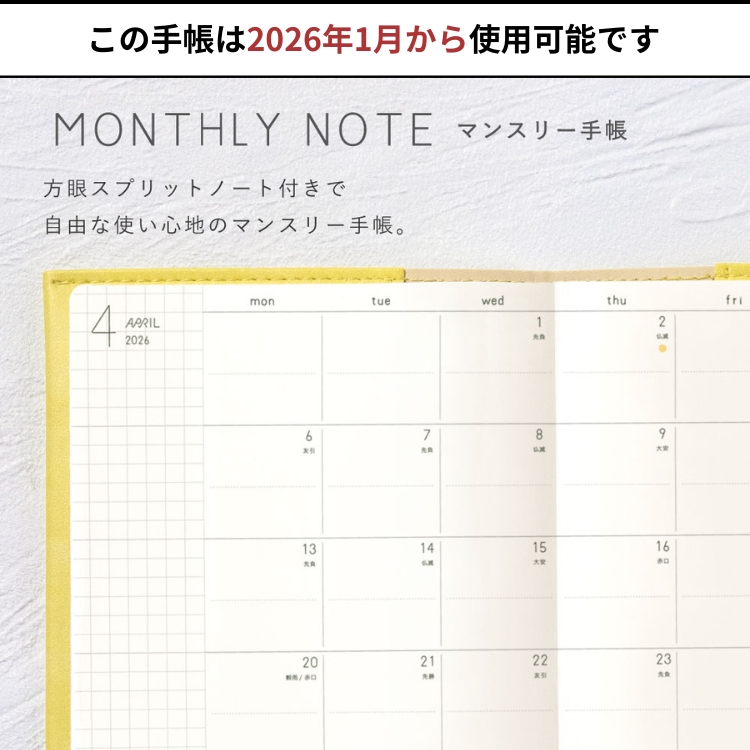 SUNNY手帳のマンスリーはウィークリーよりひと回り小ぶりサイズ。予定が少なめだけど、ノートはたくさん書きたい派さんのマンスリー&ノートの手帳です。