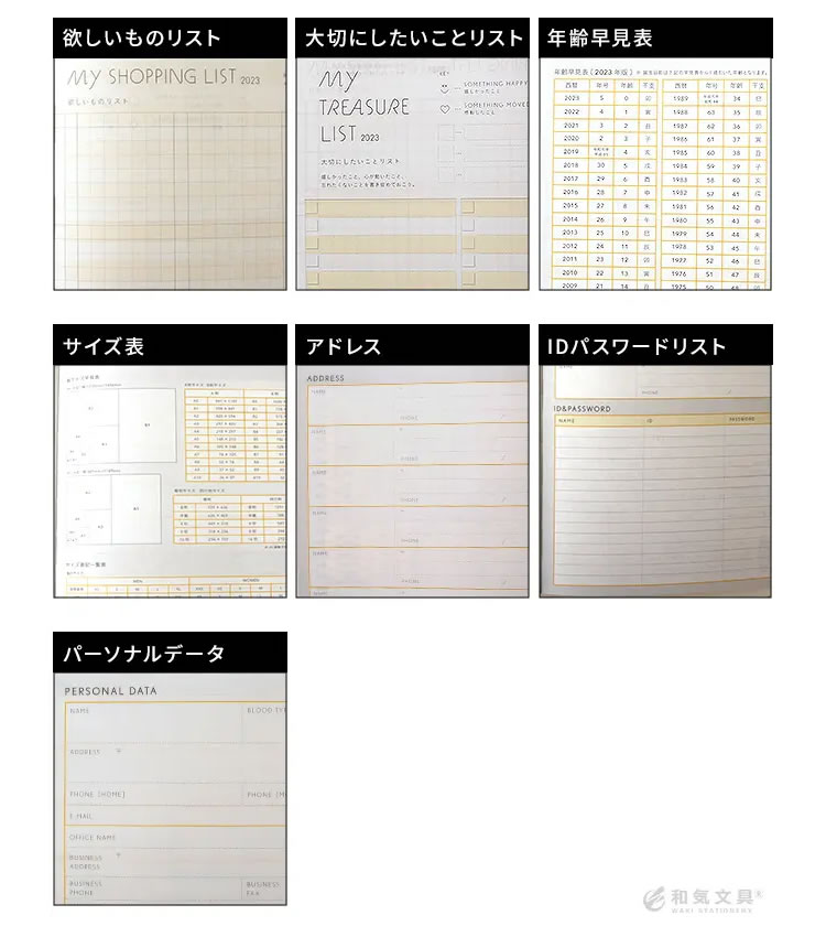 ・おまけページ(サイズ表・年齢早見表・パーソナルデータ・IDパスワードリスト・アドレス…5ページ)