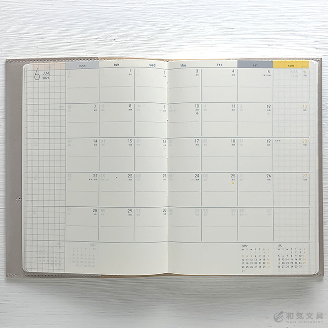 SUNNY手帳のマンスリーはウィークリーよりひと回り小ぶりサイズ。予定が少なめだけど、ノートはたくさん書きたい派さんのマンスリー&ノートの手帳です。