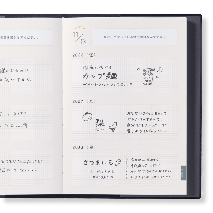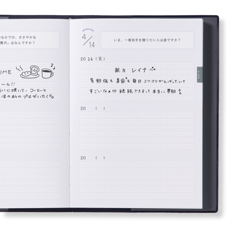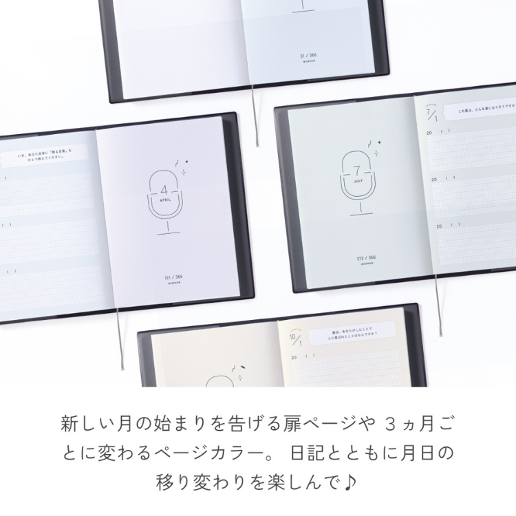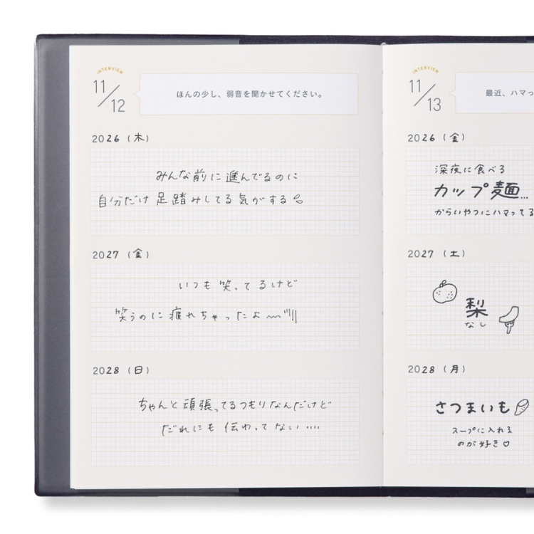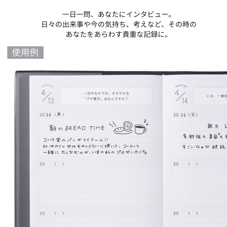 「自分」を楽しむインタビュー形式の連用日記1年ごとに同じ質問への回答を比べることで自分の変化や成長、ずっと変わらず大切にしていることを知ることができます。質問があるから書く内容に迷わず、日記初心者にもおすすめ。年号フリータイプなので、いつからでも始められます。
