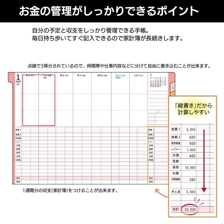 毎月の予定と家計簿がこれ1冊で管理できる!いつでも、どこでも気が付いたその場で記入できて、家計簿が苦手な人も1年間続けられた!と大評判の機能手帳です。