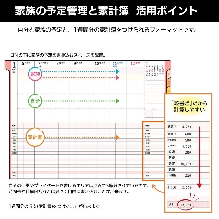 4つの書き分けスペースで、家族の予定を分けて書ける週間手帳です。