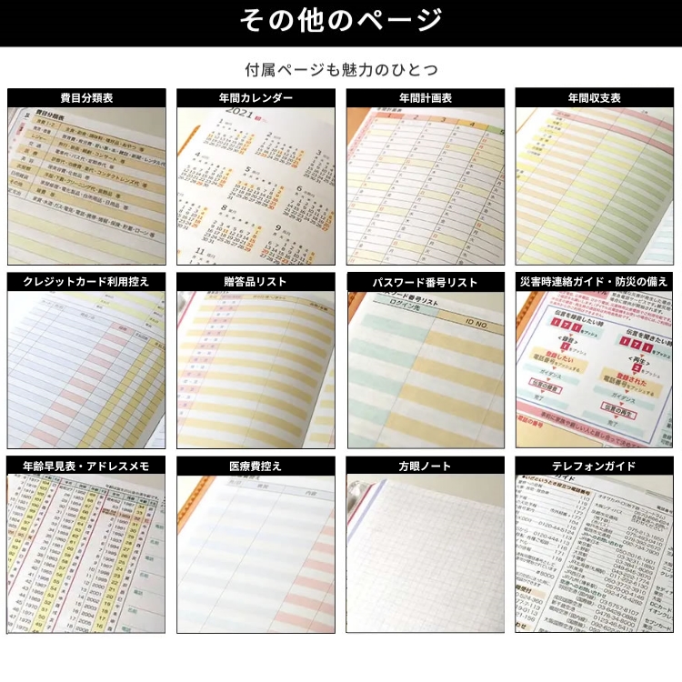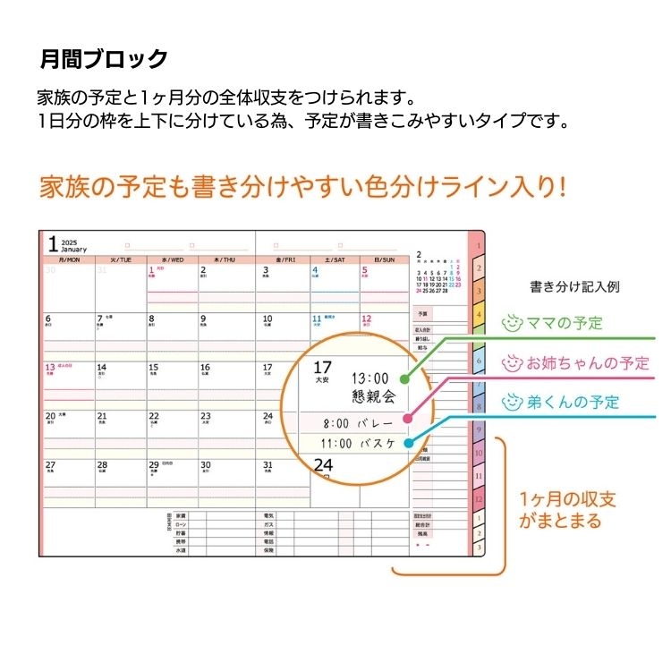 毎月の予定と家計簿がこれ1冊で管理できる!いつでも、どこでも気が付いたその場で記入できて、家計簿が苦手な人も1年間続けられた!と大評判の機能手帳です。