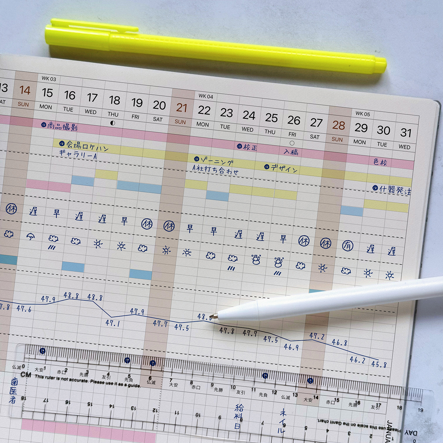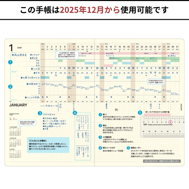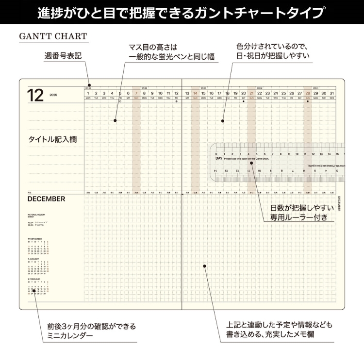 「曜日をまたいで記入できる」機能を更に便利に使うための各サイズ専用のデイト・ルーラー(日玉定規)が付属しています。※写真は旧年度版を使用しております
