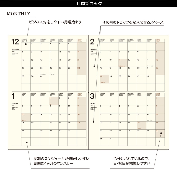 携帯性に優れたA5変型サイズの見開き1週間7日間均等のブロックウィークリーです。デスク周りの省スペースでもストレスを感じることなく書き込めます。マンスリー部分はガントチャート式なので、タスク別で俯瞰しやすい設計。ウィークリー部分は、1日マスの上下分割線によってAM/PM、オン/オフなどの書き分けが可能。小さくてもデスクダイアリー並みの機能を兼ね備えています。