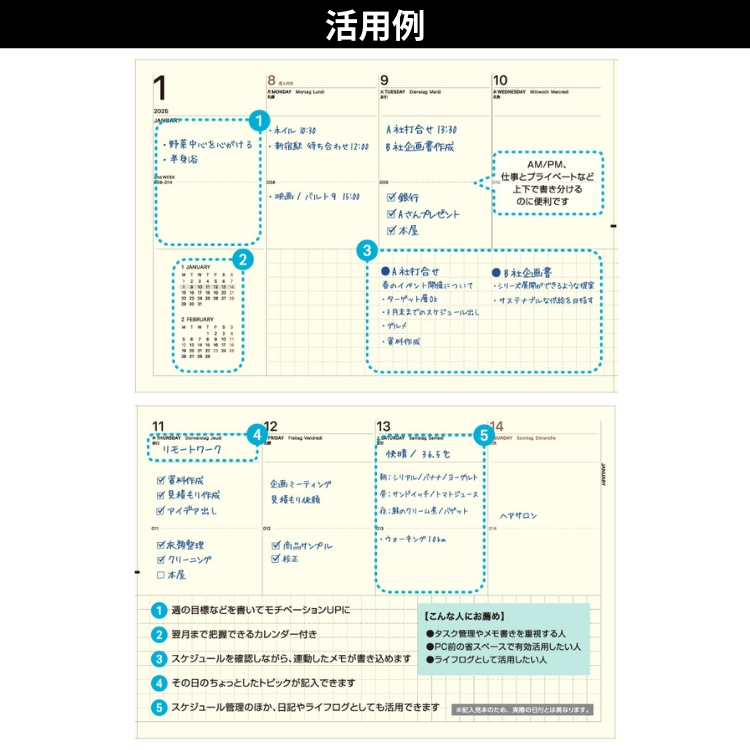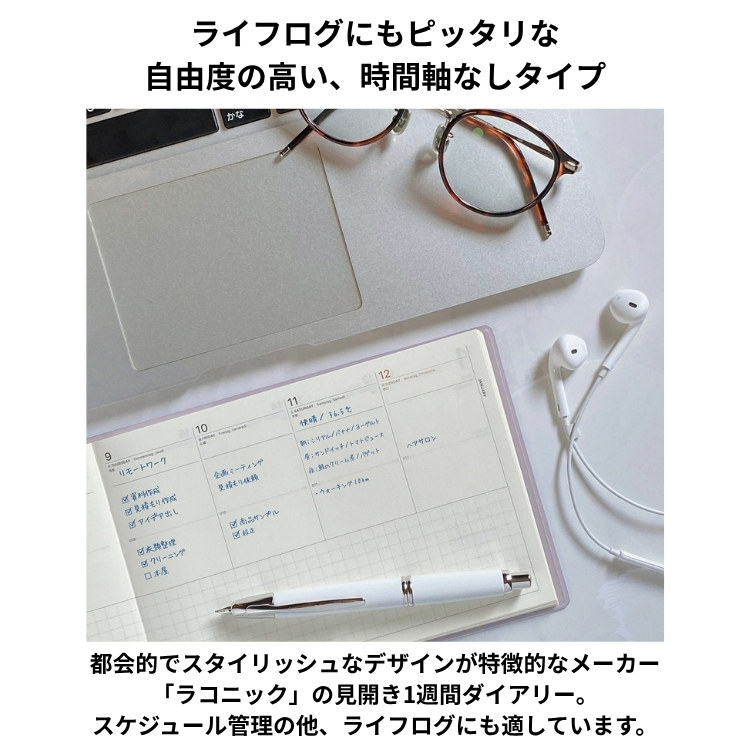 LACONIC(ラコニック)9月始まりのB6サイズ見開き1週間のライフログ・ダイアリー。日々の変化を直感的に把握。記録やスケジュールなど、これ1冊で管理することが可能です。9月始まり手帳なので翌年12月までの16ヶ月間使えるのも嬉しいトコロ。