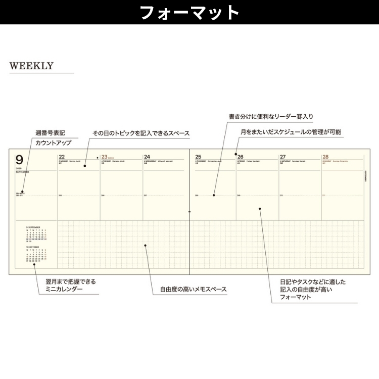 LACONIC(ラコニック)の9月始まりB6サイズ週間ブロック手帳。毎日のタスク管理や日記など、しっかり書けるから用途が広がるフォーマット。9月始まり手帳なので翌年12月までの16ヶ月間使えるのも嬉しいトコロ。