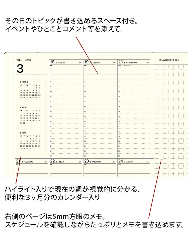 都会的でスタイリッシュなデザインが特徴的なメーカー、LACONIC(ラコニック)の3月始まりA5週間バーチカル+メモ手帳です。7-24時の詳細な時間管理&メモに最適な方眼ノートでスケジュール管理をする人にうってつけのフォーマットです。また、16ヶ月間使えるのも嬉しいトコロ。