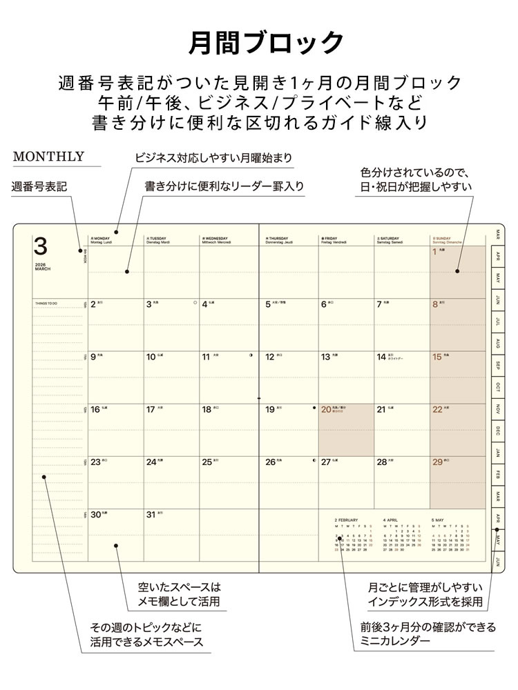 月ごとのインデックス付きなので、月単位での情報管理がしやすいレイアウトです。見開き1週間の7日間均等ブロック式で時間軸がないのでウィークエンドがオフでない方や、日記や日々のタスク管理にもオススメ!使えるポケットと品良く見えるシンプルさが素敵な、オフィスワーカーから学生さんまで、幅広く使い勝手の良い手帳です。