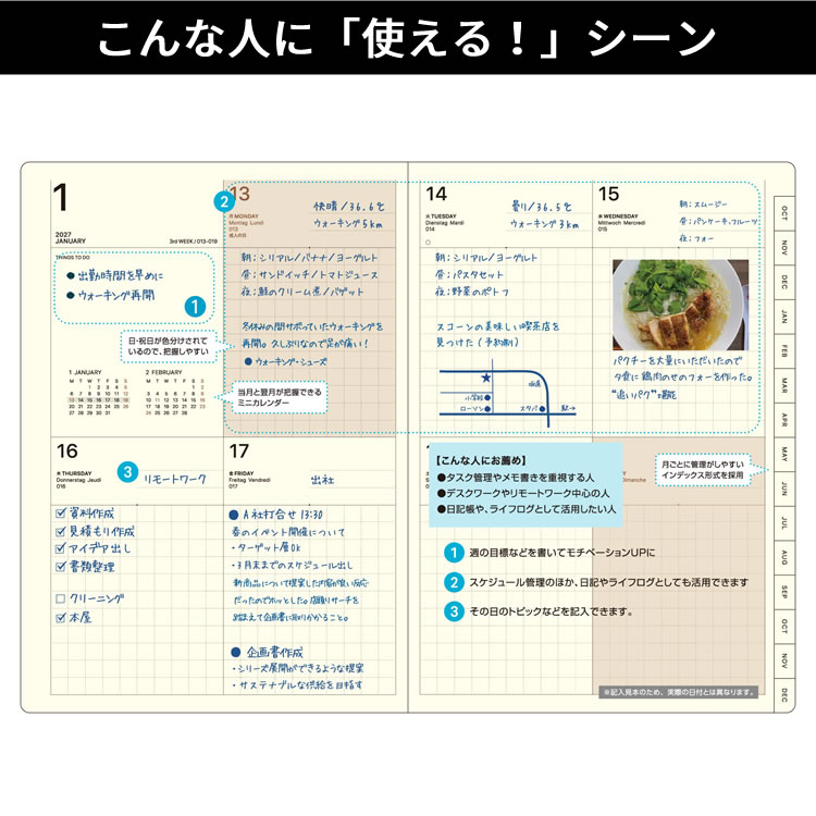 月ごとのインデックス付きなので、月単位での情報管理がしやすいレイアウトです。見開き1週間の7日間均等ブロック式で時間軸がないのでウィークエンドがオフでない方や、日記や日々のタスク管理にもオススメ!使えるポケットと品良く見えるシンプルさが素敵な、オフィスワーカーから学生さんまで、幅広く使い勝手の良い手帳です。