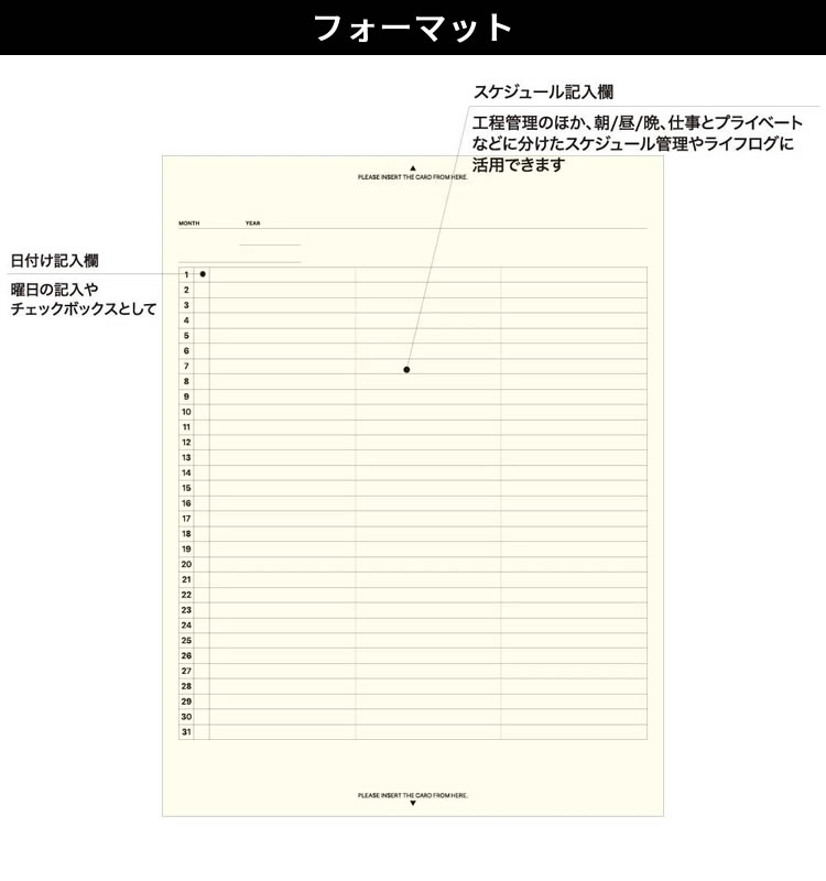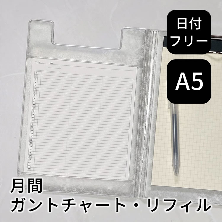 A5フィールドパッド専用、ガントチャート式のタテ型マンスリー(12ヶ月/6枚)です。日付フリーなので、思い立ったその日からすぐに使い始めることができます。