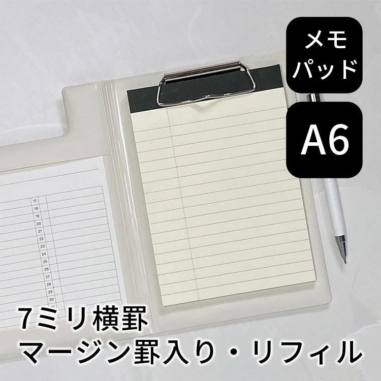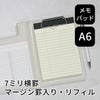 A6フィールドパッド対応、情報の書き分けや検索がスムーズに行えるマージン罫入りの7mm横罫タイプのメモパッド(40シート)です。
