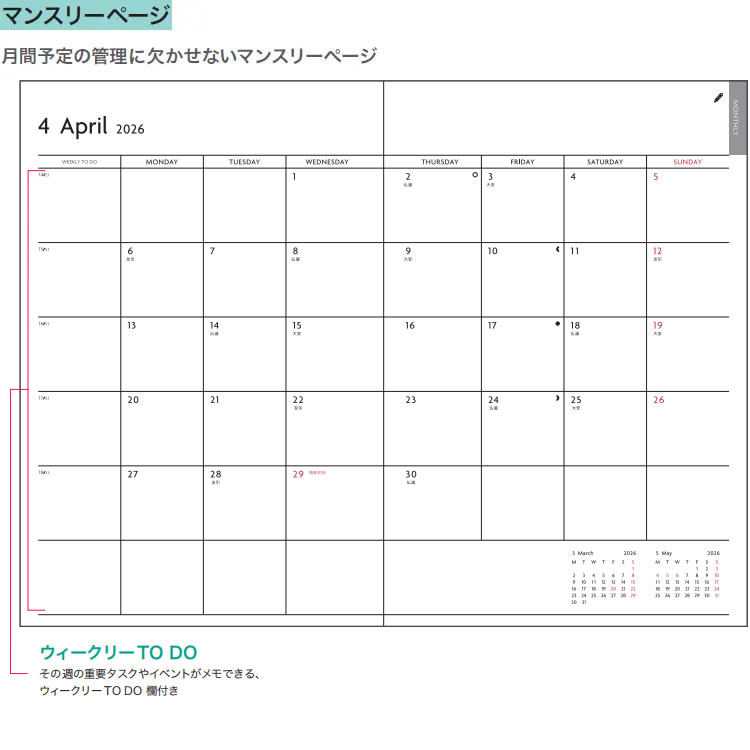 仕事や家庭の予定など、スケジュール管理はもちろん日々の記録を書き残す日記帳としても活躍する自由度の高い手帳です。