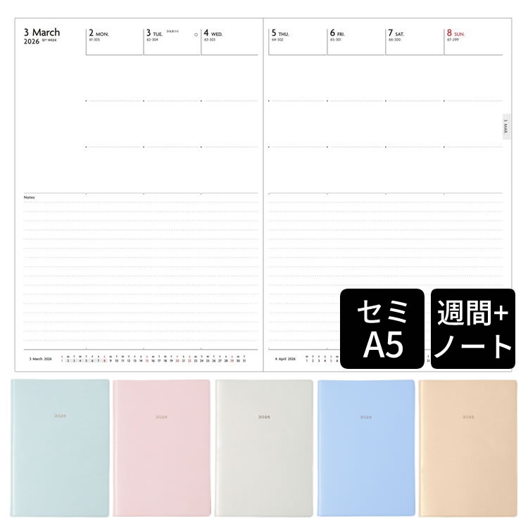 サイズはA5正寸よりも少し小さなオリジナルサイズの「セミA5サイズ」。持ち運びのしやすさとのびのび書けるサイズ感のバランスが取れた大きさです。フォーマットは「週間ノート」。自由度が高いざっくり3分割のバーチカルなので、仕事以外にも資格勉強やライフログにも使いやすいです。