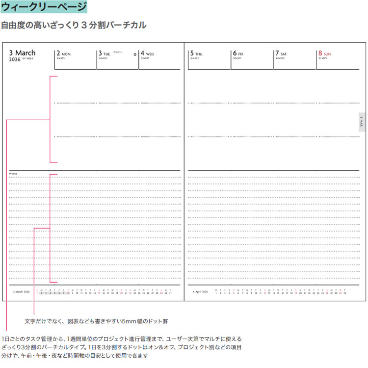 スケジュール記入スペースはドット罫で1日を3分割。この区切りを使えばざっくりとしたバーチカル的な時間軸のスケジュール管理だけでなく、プロジェクトを項目別に分けて管理したり、オフや家族の予定も同時に管理したりなど、様々な用途に活用できます。7日均等タイプで学生さんから社会人、老若男女問わずお使いいただけますよ。