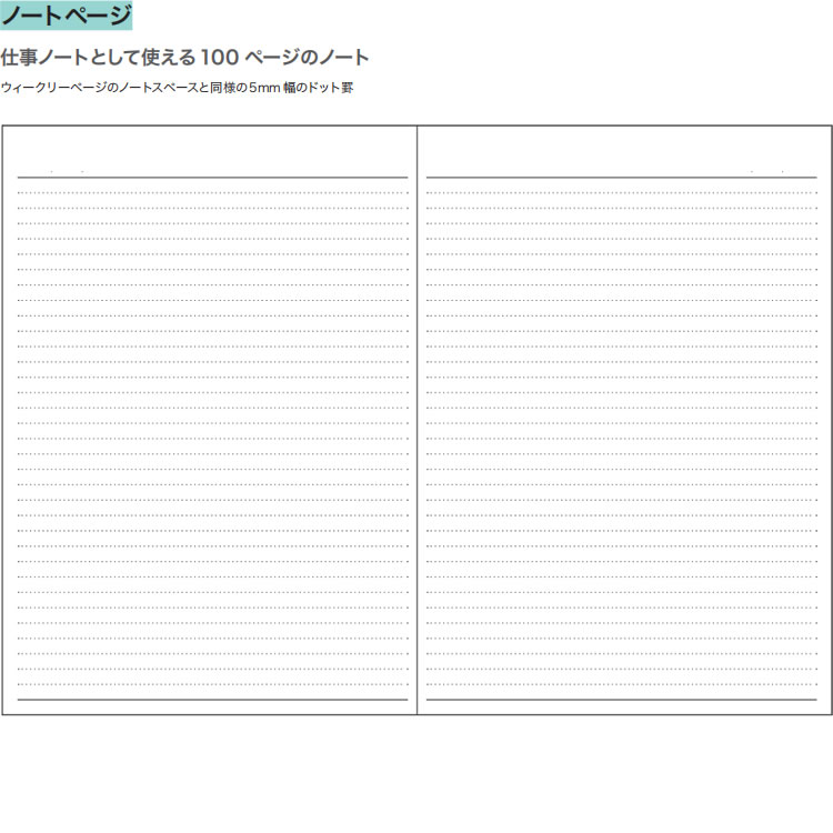 上半分が三分割されたざっくりバーチカル型の週間スケジュールページ、下半分がたっぷりのノートスペースという自由度の高いレイアウトが魅力。さらに、後ろにたっぷりのノートページ付きなのでまさに「ざっくり手帳 + たっぷり仕事ノート」が1冊になった形なんです。文字だけでなく図表も書きやすく仕事の発想力を高めます。