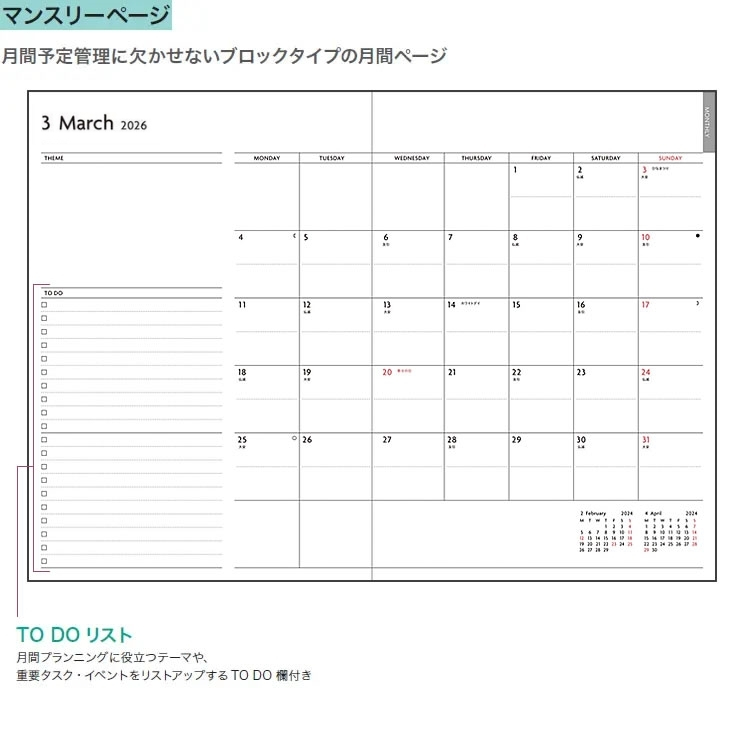 自由度の高いフォーマットが魅力の週間手帳「エディット スープル・プリュス」スケジュール記入スペースはドット罫で1日を3分割。この区切りを使えば、午前・午後・退社後などのざっくりとしたバーチカル的な時間軸のスケジュール管理だけでなく、プロジェクトを項目別に分けて管理したり、オフや家族の予定も同時に管理したりなど、様々な用途に活用できます。