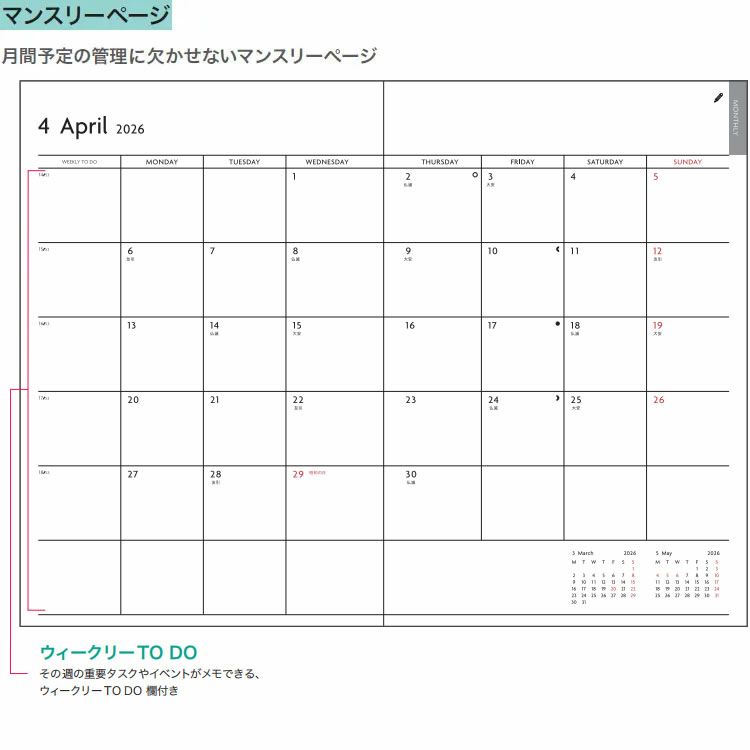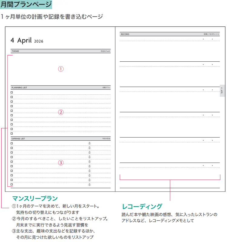 仕事や家庭の予定など、スケジュール管理はもちろん日記帳としても活躍する自由度の高い手帳です。