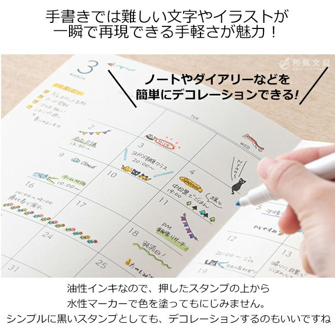 にじまずキレイに押せて、スタンプの上から水性マーカーで色を塗れる、ノートやダイアリーなどを簡単にデコレーションできる楽しいスタンプです。手帳やノート、ふせんに押して楽しめます。